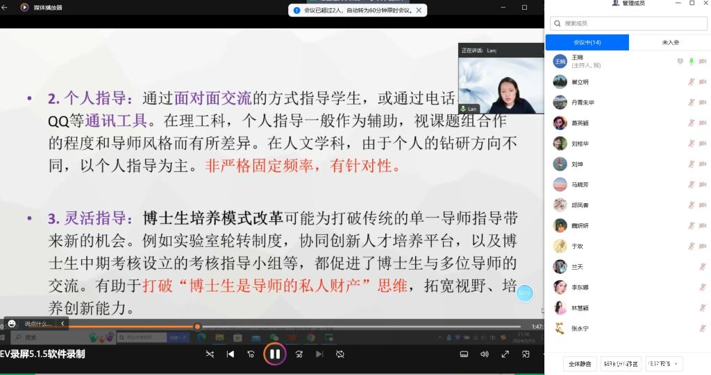 学院立足于研究生教育,履行党史学习教育办实事的责任义务,着力打造高水平研究生导师队伍,助力我院教师成长成才。5月22日,我院以线上形式开展 “导师指导过程与师生关系如何影响研究生培养质量”的培训会。我院14位硕士研究生导师参加本次专题培训。